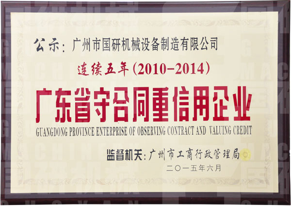 “連續(xù)五年(2010-2014)廣東省守合同重信用企業(yè)”的牌匾在廣州市國研機(jī)械設(shè)備制造有限公司的文化展示墻上格外引人注目,這是對公司多年堅(jiān)持誠信經(jīng)營的充分肯定,也是公司企業(yè)文化“誠信、創(chuàng)新、分享、精進(jìn)”的客觀體現(xiàn)。