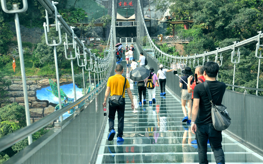 兩小時(shí)的小北江之游,大家都還余味未盡。導(dǎo)游又帶上大家趕往這次團(tuán)建活動的重頭戲的目的地:古龍峽的“云天波霸”。今天公司參加團(tuán)建的所有員工都要挑戰(zhàn)目前世界上較寬的高空玻璃橋,玻璃橋像一條通體透明的巨龍連接著峽谷兩岸,橋下懸空超過100米,站在橋上向下看,真是令人心驚膽戰(zhàn),大家相互鼓勵(lì),三三兩兩牽手前行,用相互的關(guān)愛順利通過并成功抵達(dá)世界較大直徑的懸空玻璃平臺。盡管大家都汗流浹背,但每個(gè)人臉上都洋溢著喜悅。因?yàn)榇藭r(shí)大家都收獲了克服恐懼心理后戰(zhàn)勝困難的勇氣和成功!